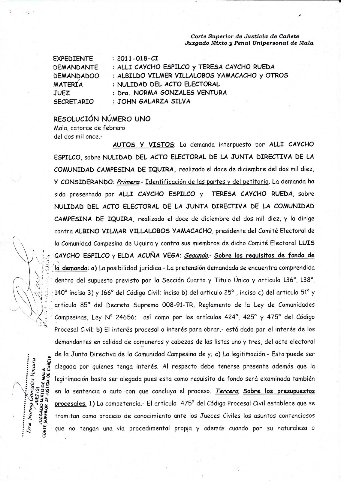 Se resuelve: Primero: Admitir a trámite la demanda sobre nulidad del ACTO ELECTORAL DE LA JUNTA DIRECTIVA DE LA COMUNIDAD CAMPESINA DE UQUIRA, de fecha doce de diciembre del dos mil diez interpuesto por ALLI CAYCHO ESPILCO y TERESA CAYCHO RUEDA en la VIA DEL PROCESO DE CONOCIMIENTO" dice el documento en mención que se adjunta al presente informe.